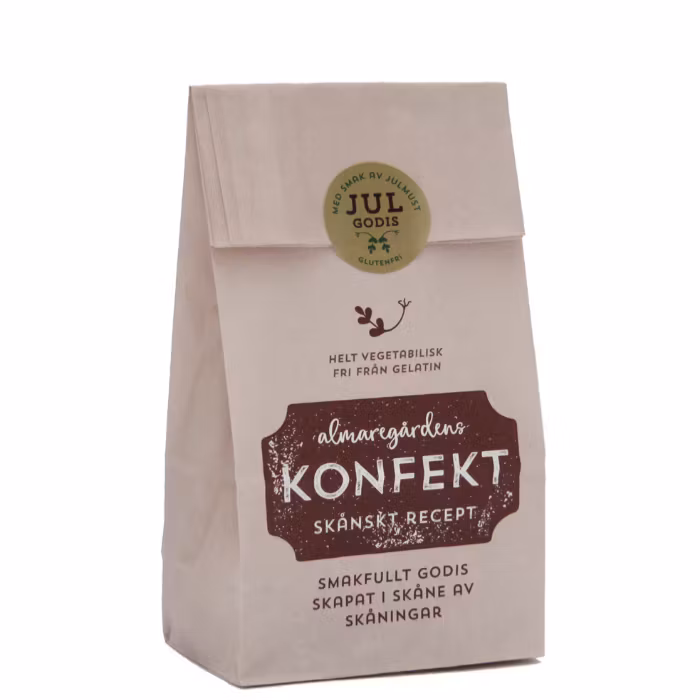 En söt konfektbit med smak av julmust.Varje påse innehåller 150 gram konfekt.Almaregårdens julkonfekt med smak av julmust är tillverkad på Söderslätt i Skåne av