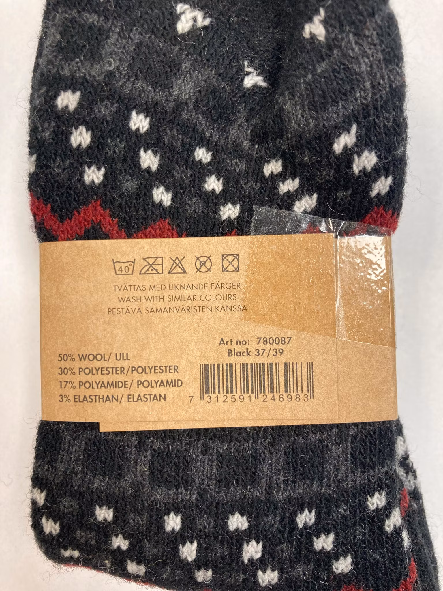 Svarta ullsockor stl 37/39 80 kr 50 kr Svarta ullsockor med rött, vitt och grått mönster. Stl 37/39, Woodstock I lager. Lägg i korgen Dela Lagersaldo: 3 Artikelnummer: 13479 Information Svarta ullsockor med rött, vitt och grått mönster. Stl 37/39, Woodstock